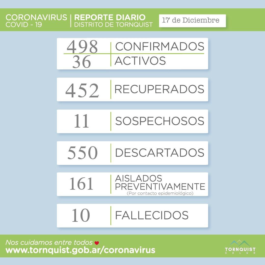 Los casos confirmados suman 498, de los cuales 36 son activos. Hay 452 recuperados, 11 sospechosos, 550 descartados, 161 personas aisladas preventivamente y 10 fallecidos.