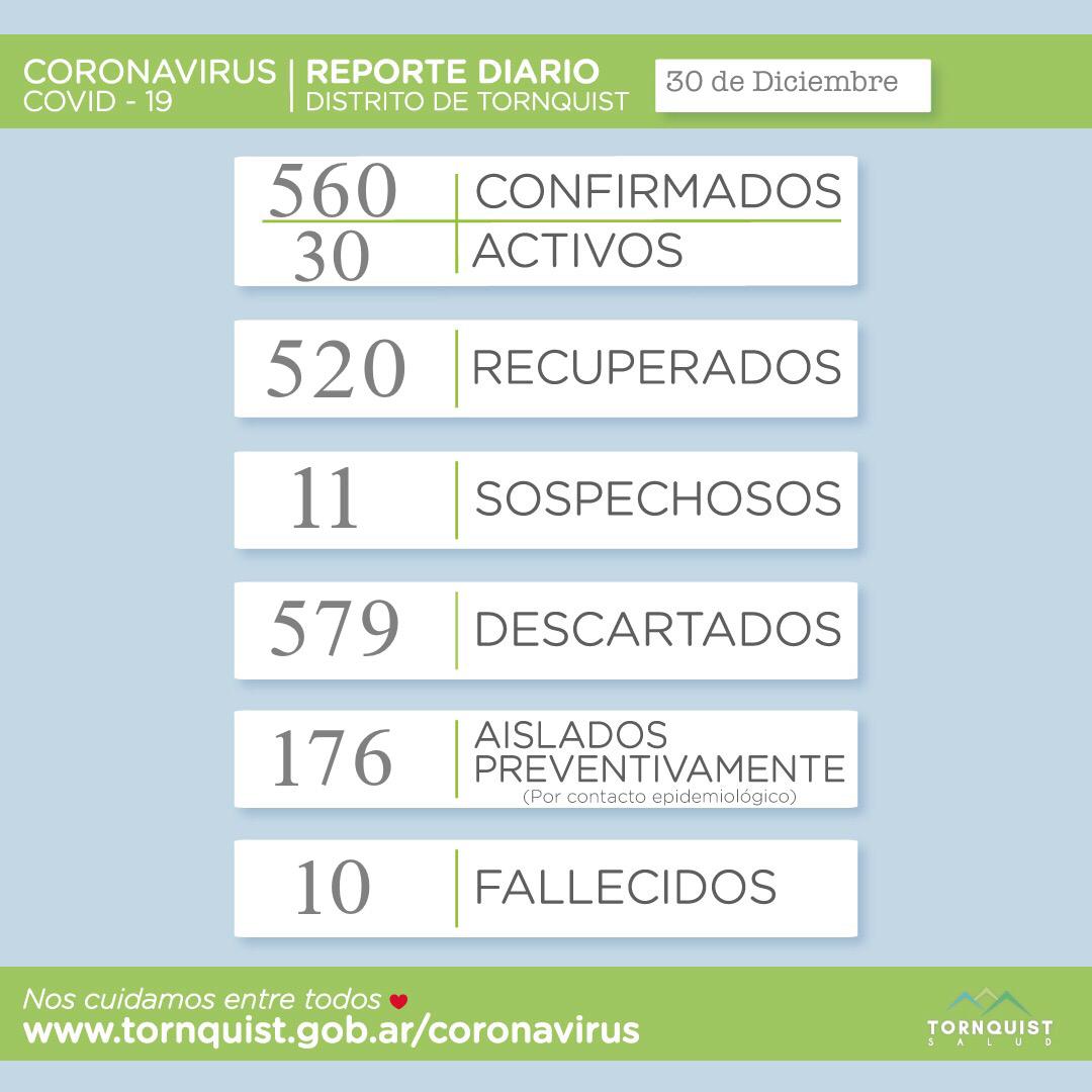 Ahora suman 560 los casos confirmados, de los cuales 30 permanecen activos, hay 520 recuperados, 11 sospechosos, 579 descartados, 176 personas aisladas preventivamente y 10 fallecidos.