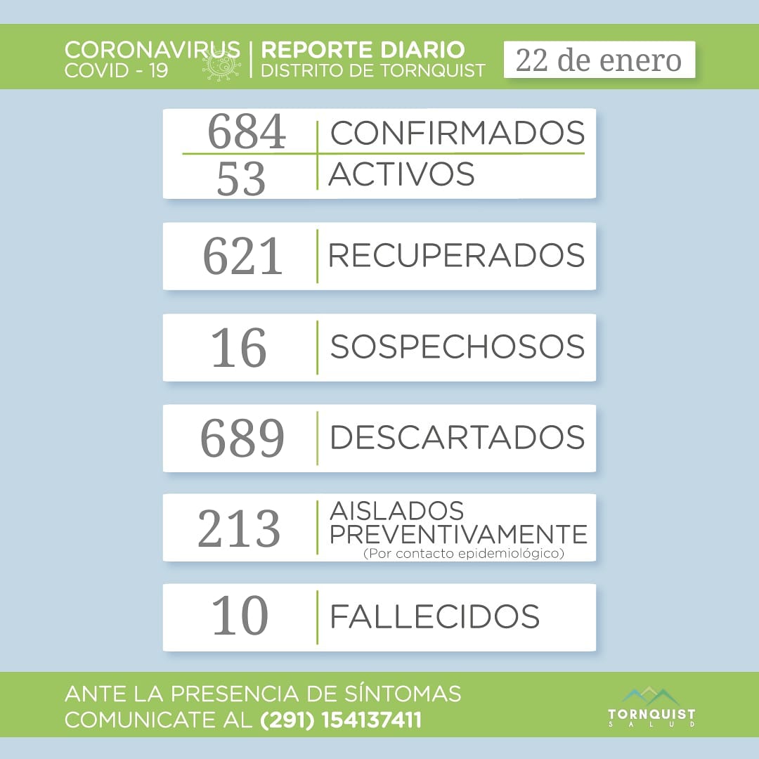 El total de activos es de 53 casos, los confirmados alcanzan las 684 personas, 621 recuperados, 689 descartados, 213 personas aisladas de manera preventiva y 10 fallecidos.