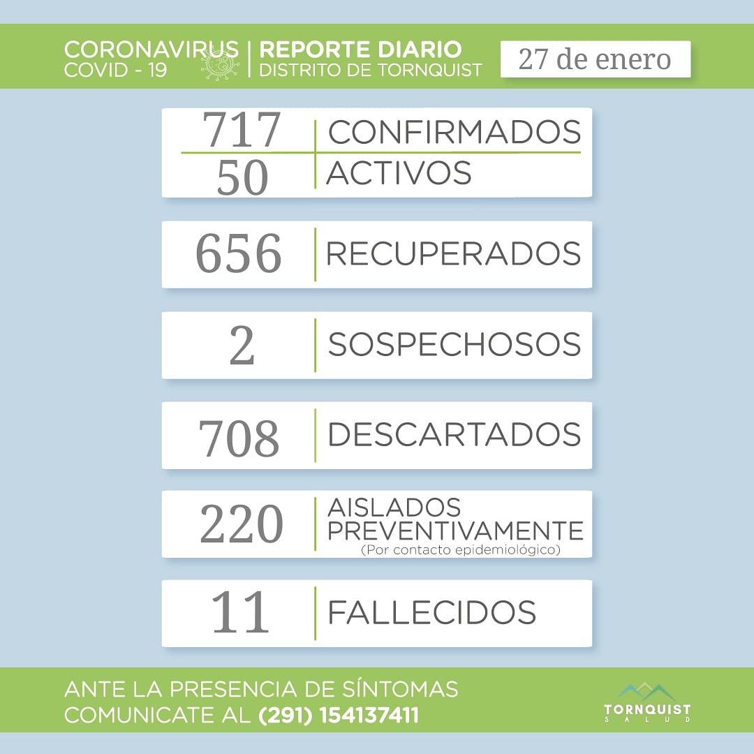 Los confirmados a la fecha suman 717, hay 50 activos, 656 descartados. 2 sospechosos, 708 descartados. Hay 220 personas aisladas preventivamente y 11 personas fallecidas.