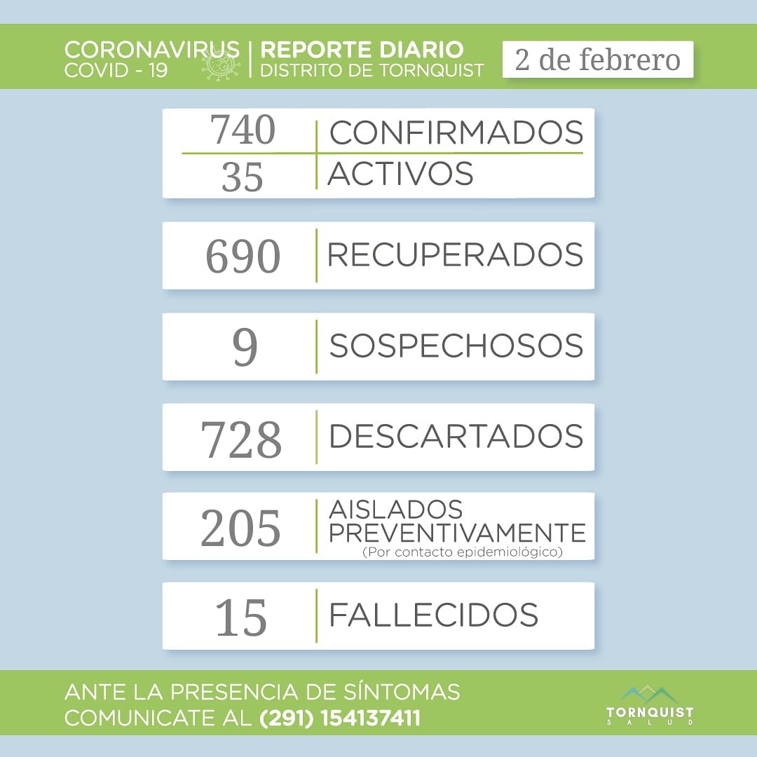 El total de activos llega a 35 casos (23 en Tornquist, 6 en Sierra de la Ventana, 3 en Saldungaray y 3 en Villa Ventana), 740 confirmados, 690 recuperados, nueve sospechosos, 728 descartados, 205 personas aisladas de manera preventiva y 15 fallecidos.